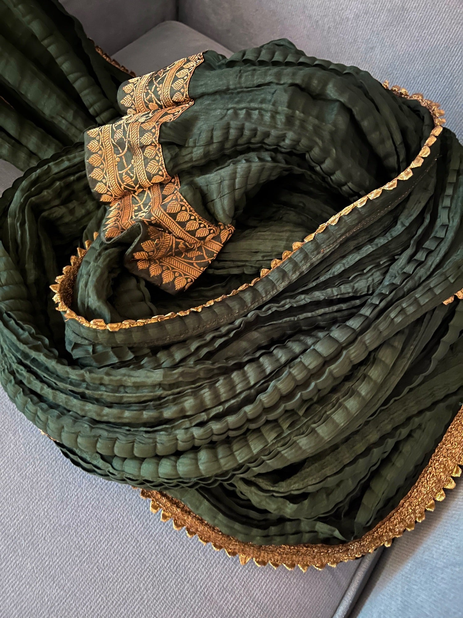 Our youthful ensemble is crafted from pure Tussar silk, featuring interwoven Zari design and Banarsi borders on the sleeves and daaman for a royal touch. It is adorned with zardozi work on the neckline and a handworked peacock motif on the side, adding a contemporary flair to the ensemble. The short shirt is paired with a sleek skinny shalwar. This ensemble is perfect for those seeking a stylish and modern look.
